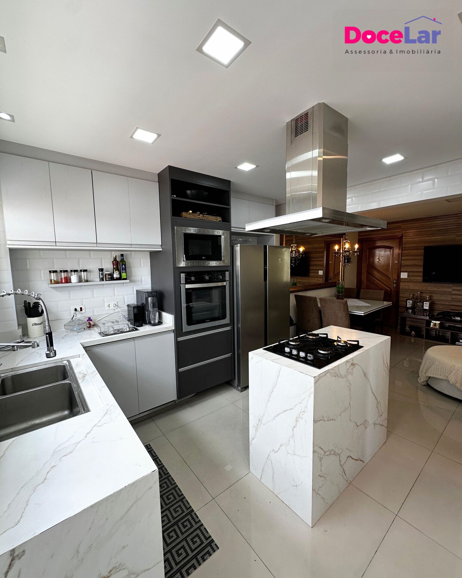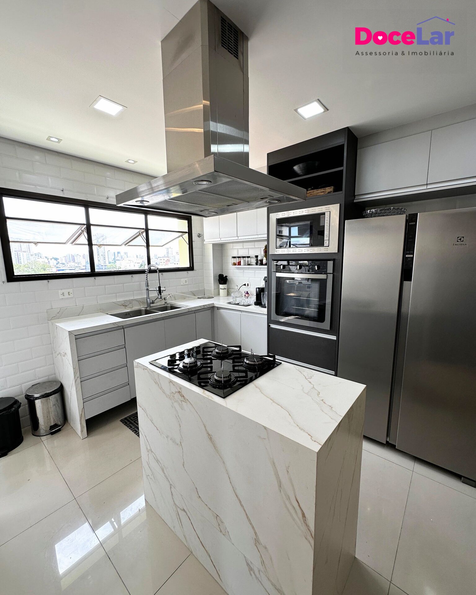 ▫️Cozinha com armários planejados, forno e micro-ondas embutidos, coifa, cooktop, pia dupla, lixeira embutida, torneiras de primeira linha e bancada branca com ilha